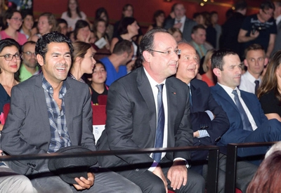 Et François (et deux ministres, Benoit Hamon et Aurélie Filippetti, à peine visible sur la photo) chez Djamel, pour… un concours d’improvisation !
